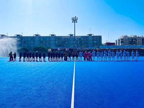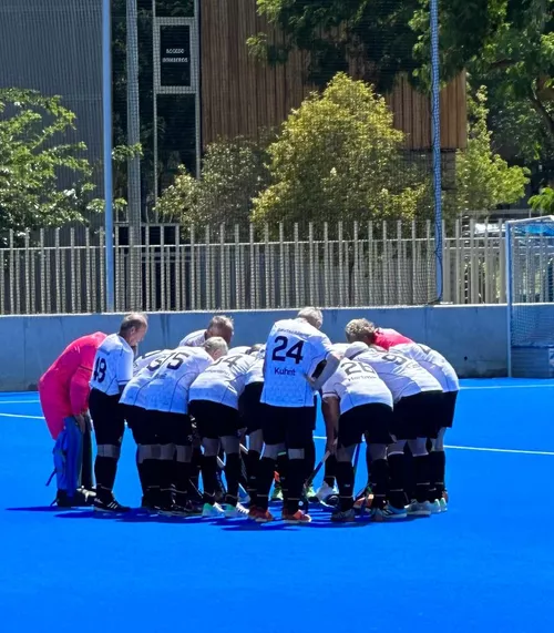 Mit „erleichterten“ Bedingungen von 28° um 10 Uhr startete das M65 SoM-Team ins Turnier. Erster Gegner waren die Mannen von Southern Cross, die SoM Mannschaft der Australier, die an unserem Kontinentalturnier teilnehmen dürfen. Wir hatten schon ein bisschen Respekt vor den Dauerläufern aus Down Under und gingen etwas verhalten ins Spiel. Aber wir brauchten uns nicht verstecken und so begann von Anfang an ein gleichwertiger Schlagabtausch. Die erste Gegenecke in der 5. Minute konnte gut abgewehrt werden und weitere Kreiseintritte der Gegner konnten verhindert werden. In der 19. Minute war es dann allerdings der Schiedsrichter, der ein unglückliches Schlägerschlagen im Gewühl von Tom Hagen am 7-Meter-Punkt direkt mit einem 7-Meter bestrafte, obwohl noch weitere Abwehrspieler einen Torschuss verhindern konnten. Diese Chance ließ sich der australische Kapitän nicht nehmen. Leider hatte unser TW Billy Billhöfer nicht das Glück des Tüchtigen und der halbhoch links geschossene Ball rutschte von seinem Schläger unter dem Arm durch ins Tor. Wir ließen uns nicht verwirren und starteten gleich gute Angriffe, die dann auch in der 22. Minute zu unserer ersten Ecke führten. Der erste Schuss wurde nach rechts abgewehrt, aber gleich von uns wieder in den Schusskreis geschlagen. Dort wurde der Ball vom Gegner hoch abgefälscht auf den 7-Meterpunkt gespielt, wo ihn unser freistehender Kapitän Manfred Teichelkamp in bester Tennismanier über Kopf mit einem Volley in den Torwinkel beförderte. Leider hatte der Schiedsrichter den Vorteil nicht abgewartet und den hohen Ball als gefährliches Spiel mit einer Strafecke abgepfiffen. Die Folgeecke konnte der TW dann halten und ins Seitenaus kicken. Weitere Aktionen fanden dann im Mittelfeld statt, wo die Australier sich leichte Vorteile erspielten.