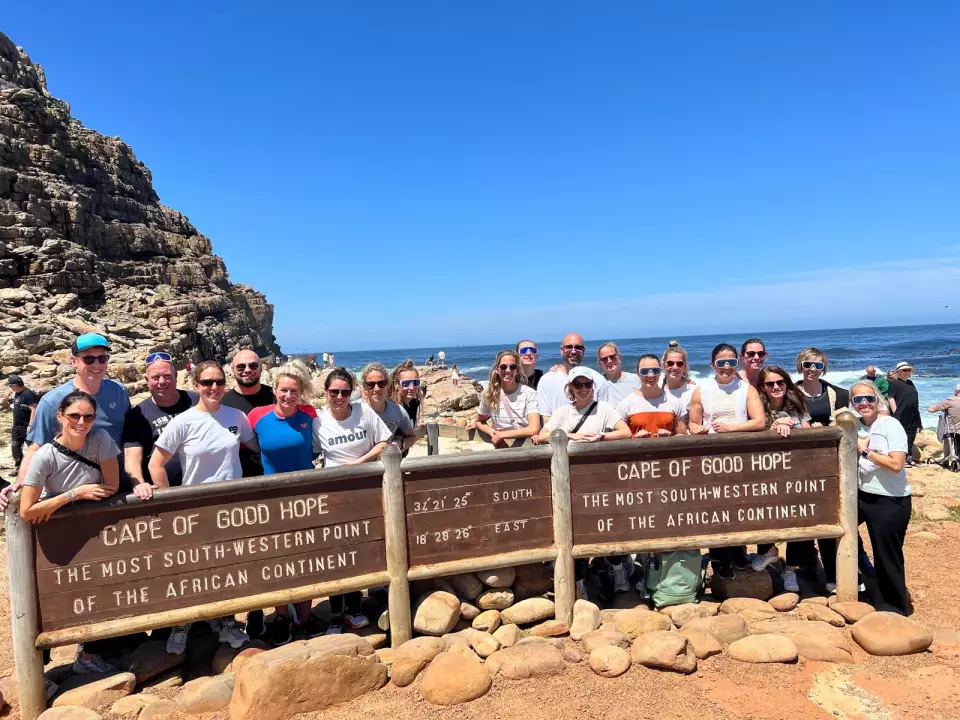 Auf dem Weg zum Chapman's Peak Drive hielten wir für Fotostopps an, bevor wir das Naturschutzgebiet am Kap der Guten Hoffnung erreichten. Dort gab unsere Guide uns einen umfassenden Überblick über die Gegend. Wir unternahmen einen 15-minütigen Spaziergang hinauf zum Cape Point Lighthouse, um die spektakuläre Aussicht zu genießen. Nach diesem Abenteuer ging es weiter zur Pinguinkolonie am Boulders Beach, um die Brillenpinguine zu sehen.