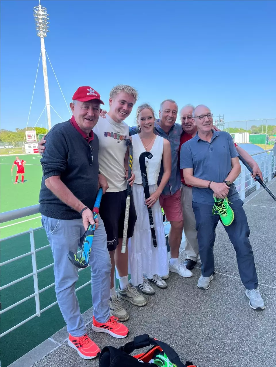 Eine kleine Delegation übergab an die Volunteers Carolin Knobling (Krefeld) und Frederik Uhl (Grasshopers Höhenkirchen) die im Hamburger Westen gesammelte Hockeyausrüstungen für das Township Hockeyprojekt. Dankbar zeigte sich Hockey-Mastermind Feico Mulders, der Organisationschef des Weltcups ist und mit Delf Ness diese Township-Initiative seit Jahren