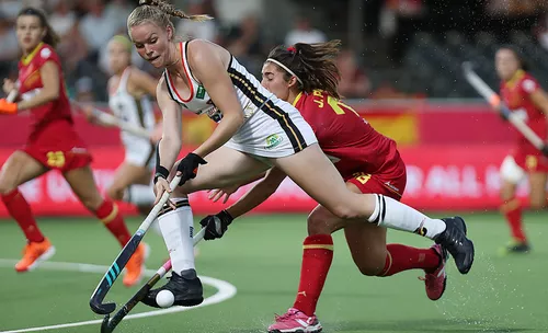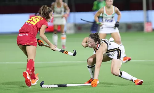 Ein Solo aus dem spanischen Mittelfeld führte zum 0:1, als Maria Lopez am Kreisrand angespielt wurde und von halblinks mit der Rückhand zum 1:0 (14.) traf. Pieper sah zum Ende des ersten Viertels noch Grün, so dass die Deutschen das zweite Viertel in Unterzahl beginnen mussten. Anne Schröder beschwerte sich bei der englischen Unparteiischen zu heftig, das ein Ball im Aus gewesen war und sah zudem noch Grün. Diese doppelte Unterzahl wurde jedoch schadlos überstanden.