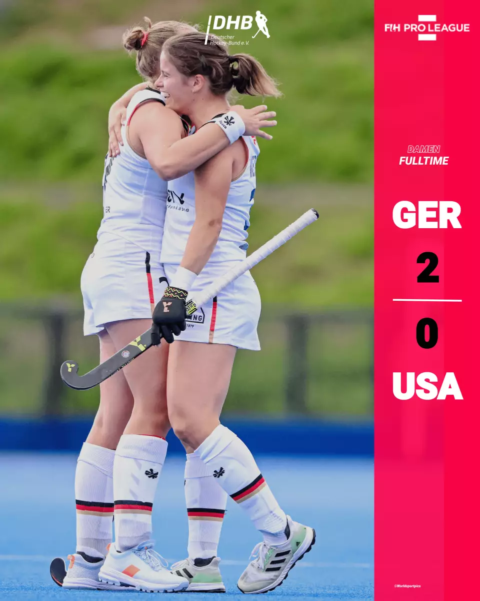 Die DANAS haben bei der FIH Pro League in London den nächsten Sieg gefeiert. Am Mittwochnachmittag gelang dem Team ein 2:0-Erfolg über die USA. Die Tore erzielten Charlotte Stapenhorst (20.) und Nike Lorenz (43.).