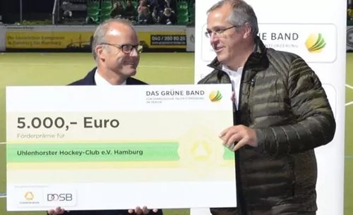 In der Halbzeitpause des Bundesligaspiels der UHC-Herren gegen den Club an der Alster am Mittwochabend überreichte Volker Korella, Mitglied der Geschäftsleitung der Commerzbank Niederlassung Hamburg Ost, die Auszeichnung und den Siegerscheck über 5.000 Euro für „Das Grüne Band 2017“ an Jan Rundshagen, UHC-Vorstand Hockeyjugend. „Wir verstehen uns schon seit langem als Ausbildungsverein. Innerhalb der letzten zwölf Jahre bekommen wir nun das dritte Mal diese Anerkennung für unser Konzept und unsere erfolgreiche Arbeit. Wir freuen uns sehr!“, so UHCs 1. Vorsitzender Horst Müller-Wieland.