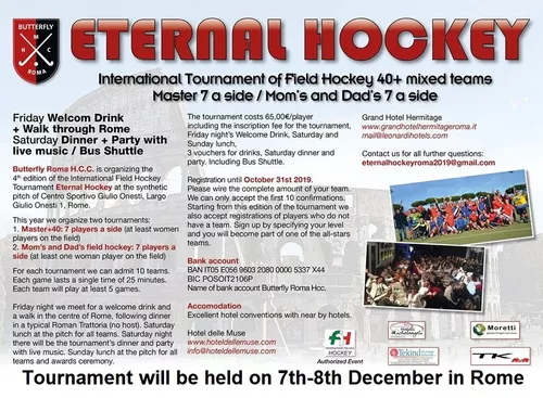 23.08.2019 - Bereits im letzten Jahr nahmen zwei deutsche Teams beim Eltern - und Mastershockeyturnier in Rom teil. Auch dieses Jahr findet das Turnier in der Vorweihnachtszeit am 7. und 8. Dezember statt.