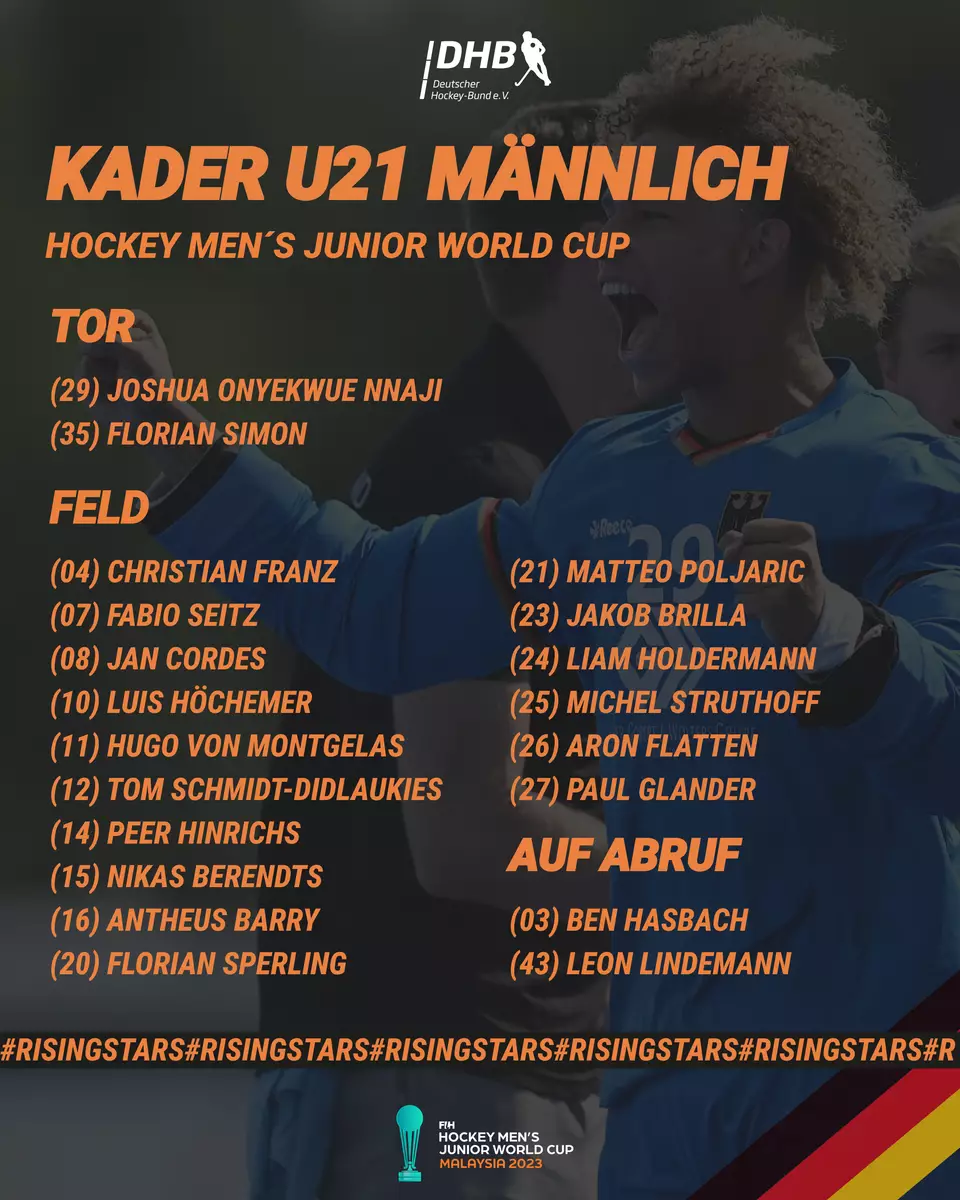 Vom 05. bis 16. Dezember 2023 spielt die deutsche U21-Junioren-Nationalmannschaft bei der Weltmeisterschaft in Malaysia um den Weltmeistertitel. U21-Cheftrainer Rein van Eijk und sein Trainerteam haben nun den Kader bekannt gegeben, mit dem sie den U21-Weltmeistertitel holen wollen. 16 Spieler, zwei Torhüter und zwei Spieler auf Abruf werden Anfang Dezember die Reise antreten. Hier gibt es alle Informationen zum Kader und zur Vorbereitung bis zum WM-Start.