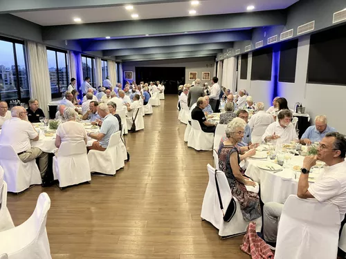 Obwohl wir uns schon nach den spanischen Gewohnheiten mit dem späten Abendessen orientiert hatten, hat es etwas gedauert, bis die insgesamt 105 Teilnehmer ihre Plätze an den Zehnern Tischen eingenommen hatten. Grund war einerseits das späte Spiel der M70 SoM, welches erst um 18:00 angesetzt war, aber auch die Feierlaune des M65-A-Teams, die gerade das schwierige zweiten Spiel gegen die Spanier gewonnen hatten. Dazu kamen noch die übervollen Bussen und Taxen, sodass einige sogar zu Fuß kommen mussten. Dies alles hatte aber nicht gestört und somit konnte Wolfgang Hillmann ca. 21:15 alle Gäste mit einer kleinen Ansprache begrüßen.