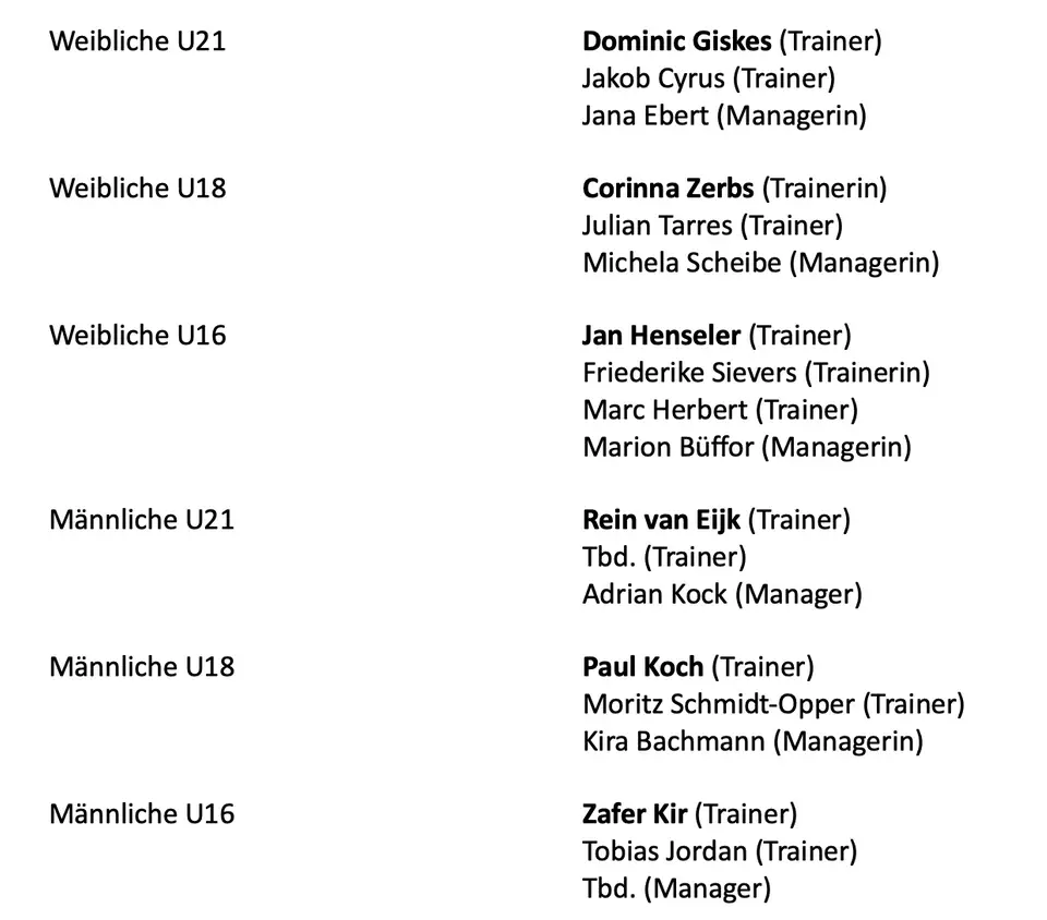 Mit der begonnenen Neustrukturierung verfolgt der DHB auch das Ziel, mehr Trainerinnen in verantwortungsvolle Funktionen zu bringen. Neue Bundestrainerin U18 Weiblich wird Corinna Zerbs, die bisher beim DHB Co-Trainerin der U21 Weiblich war und zuletzt auch den A-Kader der Damen und die U21 Weiblich beim Österreichischen Hockey-Verband betreute. Friederike Sievers ist Teil des Trainerteams U16 Weiblich. U21-Trainer der Juniorinnen wird ab Januar 2024 Dominic Giskes, der damit die Nachfolge von Akim Bouchouchi antritt. Giskes betreute bisher die U16 Männlich beim DHB. Bouchouchi wird am 01. Januar 2024 Bundestrainer Wissenschaft beim DHB. Neu in verantwortlicher Trainerfunktion für die U18 Männlich ist Paul Koch, der bisher Co-Trainer in diesem Nachwuchsteam war.