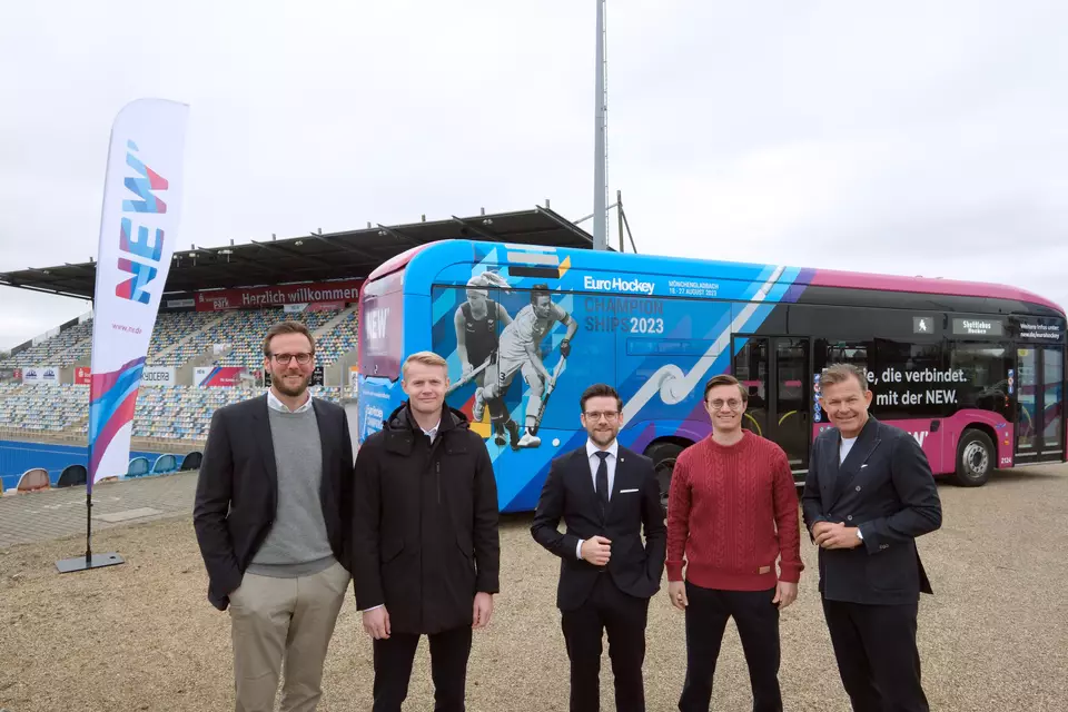 Mit einem breit gefächerten Mobilitätsangebot bringt die NEW Spielerinnen, Spieler und Fans während der Hockey-EM sicher und zuverlässig zum Hockeypark. Und ab sofort ist die Europameisterschaft auch im Stadtbild von Mönchengladbach präsent: Ein mit dem EuroHockey Championships 2023-Logo gebrandeter Bus wird ab sofort durch Mönchengladbach fahren. Die Partnerschaft zwischen der NEW und dem DHB umfasst außerdem die Zusammenarbeit online, in den sozialen Medien und vor Ort. Auch im Hockeypark wird NEW während der Europameisterschaft präsent sein.
