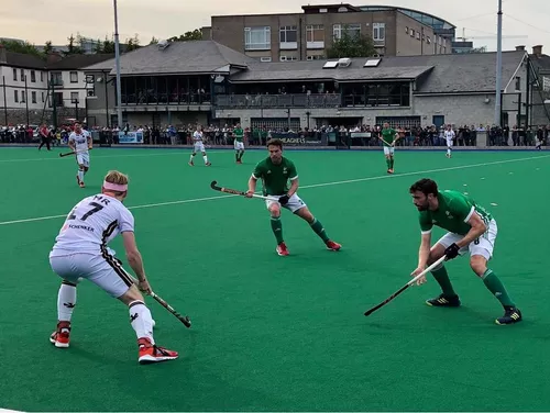 Die Deutschen begannen druckvoll, erarbeiteten sich einige Powerplay-Situationen am irischen Kreis, indem sie den Aufbau der Gastgeber aggressiv störten und schnelle Ballgewinne erzwangen. Niklas Bruns hatte die erste gute Chance mit einem Rückhandschuss vom Kreisrand (7.), den der irische Keeper David Fitzgerald aber gut parierte. In der 9. Minute verpasste Hannes Müller am langen Pfosten einen Tipp-in, doch wegen Fuß eines Iren gab es die erste Ecke, bei der Fitzgerald aber erneut Sieger gegen Dieter Linnekogel blieb.