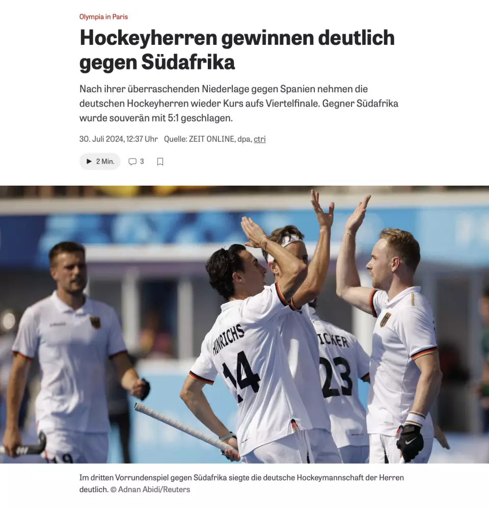 Zeit Online (dpa): Hockeyherren gewinnen deutlich gegen Südafrika