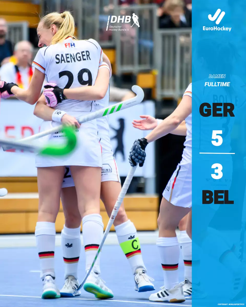Die letzten zehn Minuten begannen die Hallen-DANAS wieder ohne Torhüterin und mit sechs Feldspielerinnen. Sie kamen zu zahlreichen Torabschlüssen, doch die belgische Torhüterin glänzte in dieser Phase mehrfach. Erst in der 37. Minute gelang Deutschland das 5:2. Laura Saenger schoss ihr insgesamt viertes Tor von halblinks ins kurze Eck. Das Spiel endete mit einer Strafecke für Belgien, die Marie Ronquetti im deutschen Tor versenkte. Endstand 5:3 und Deutschland gewann auch sein letztes Gruppenspiel bei der Heim-EM.