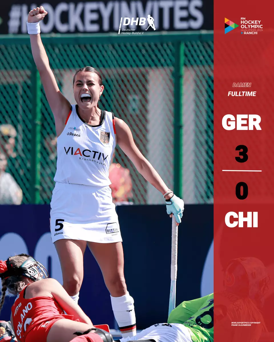 Die deutschen Hockey-Damen wollten im vierten Viertel den Sack zu machen und stürmten sofort nach Wiederanpfiff nach vorne. Daraus resultierte ein Konter für Chile, bei dem die chilenische Stürmerin völlig allein im Kreis stand. Doch Linnea Weidemann kämpfte mit zurück und konnte die Situation in letzter Sekunde entschärfen. In der 51. Minute holte Lena Micheel nach gutem Gegenpressing eine Strafecke für Deutschland heraus. Sonja Zimmermann konnte in drei Versuchen nicht auf 4:0 erhöhen. Im Gegenzug kam Chile noch einmal zum Abschluss, doch wieder war es Linnea Weidemann, die die Kugel im letzten Moment entscheidend abfälschte. Auch im vierten Viertel war die chilenische Torhüterin Natalia Salvador die beste Spielerin der Südamerikanerinnen. In der 57. Minute glänzte sie noch einmal bei einer Doppeltorchance der DANAS. Mit viel Ballbesitz sicherte sich Deutschland den ersten Sieg beim Olympia-Qualifikationsturnier in Ranchi. Das Spiel endete 3:0.