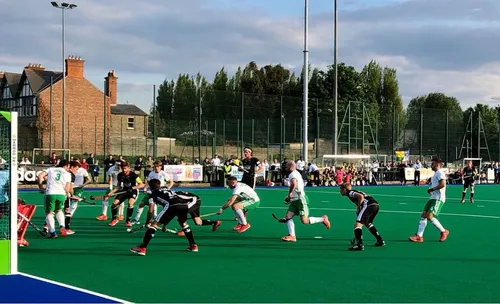 Vor 500 Zuschauern bei sonnigem Wetter in der irischen Hauptstadt hatten die sehr jung aufgestellten DHB-Herren in der Anfangsphase noch Probleme. Das erste Viertel gehörte mehr den Iren. Deren erste Ecke wurde verstoppt, den Nachschuss hielt Tobias Walter (5.). Erst als Irlands Kapitän Jonathan Bell wegen eines Wechselfehlers seiner Mannschaft mit Gelber Karte auf die Strafbank musste (8.), kamen die Deutschen besser ins Spiel. Niklas Wellen hatte die erste Chance der HONAMAS, doch sein Rückhandschuss ging rechts neben das Tor (10.). Lukas Windfeder versuchte dann bei seinem Comeback im Team nach langer Verletzungspause zum Viertelende eine Ecke in den oberen Winkel zu setzen, doch der irische Torwart Jamie Carr hielt den Schlenzer (14.).
