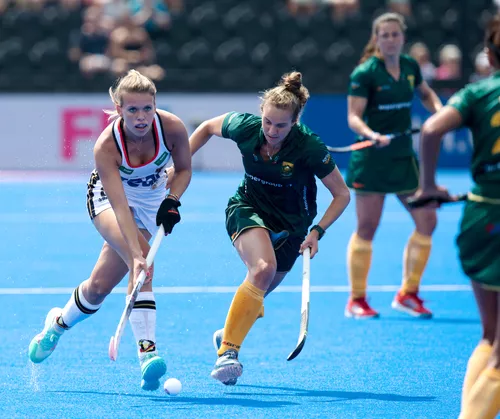 Südafrika kam in dieser Phase besser rein, hatte mehr eigene Aktionen, indem der Ball von den beiden technisch starken Spielmacherinnen durchs Mittelfeld geschleppt wurde. Dann sah Lisa Altenburg Grün (28.), die DHB-Auswahl daher in der Schlussphase der Halbzeit zwei Minuten in Unterzahl. Da hatten die Deutschen aber absolute Kontrolle. Es blieb so bei der mehr als verdienten 1:0-Führung zur Pause, die auch hätte schon höher ausfallen können.