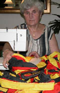 Unterstützung auf allen Ebenen - diese ältere Dame weilte eigentlich nur zufällig zu Besuch in KL und hatte alle Hände voll zu tun, um die Fangemeinde mit selbstgenähten Fahnen auszurüsten. Vielen Dank!!!